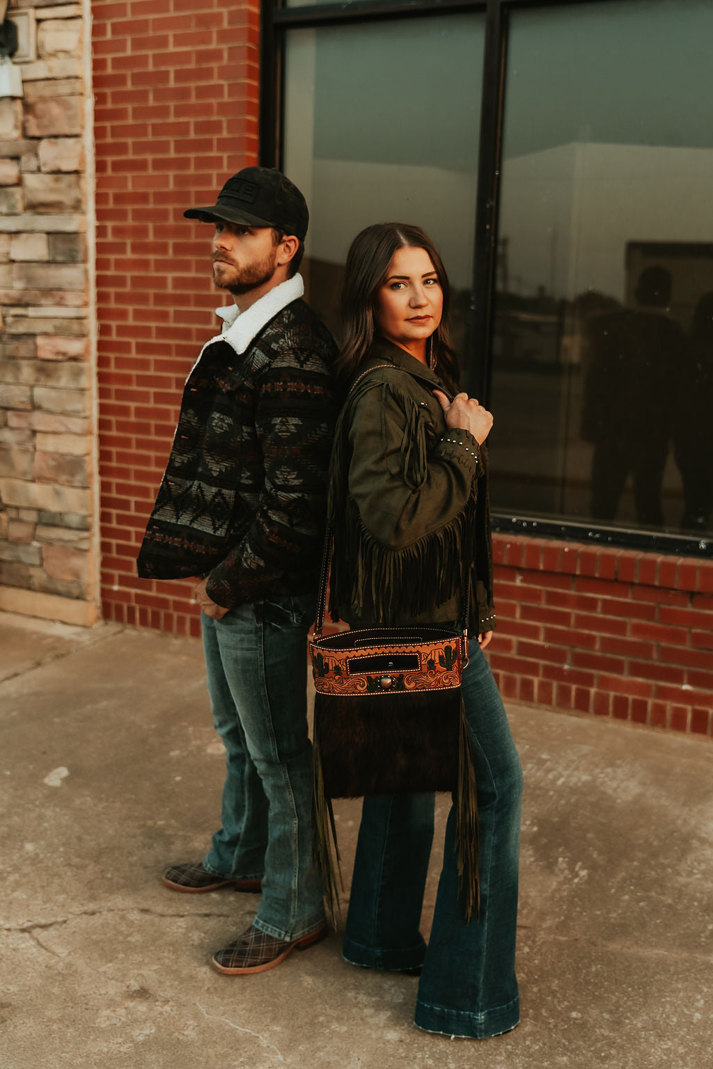 This Olive Jacquard jacket is crafted with 100% polyester and features a cozy Sherpa lining, providing warmth and comfort.